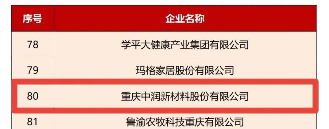 重庆中润新材料股份有限公司荣登2024重庆民营企业科技创新指数100强榜单。